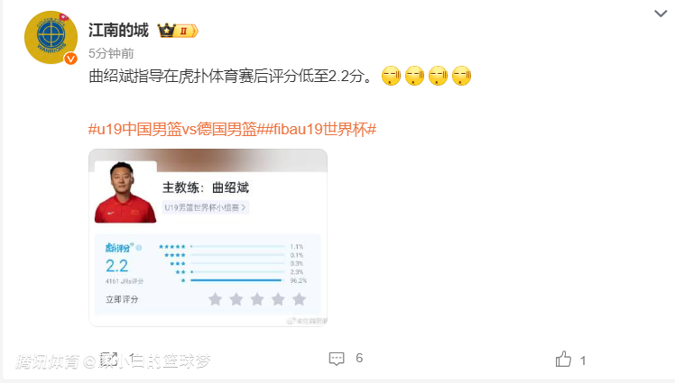 国青主帅曲绍斌这个2.2的评分已经算高了,因为有96.3%的球迷打了1星表达不满。