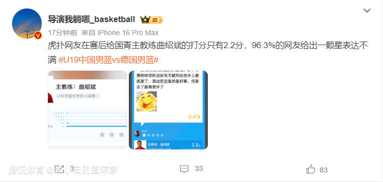 国青男篮连败曲绍斌评分2.2!96.3%球迷打1星狂喷 第三场挽尊之战