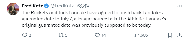 2025-06-29 22:50北京时间6月29日,根据NBA记者Fred Katz报道,火箭队已与兰代尔达成协议,将他的合同保障日期推迟至7月7日。按照兰代尔原本的合同规定,若他在6月29日没被火箭裁掉,他在2025-26赛季的薪资(800万美元)将转为全额保障。