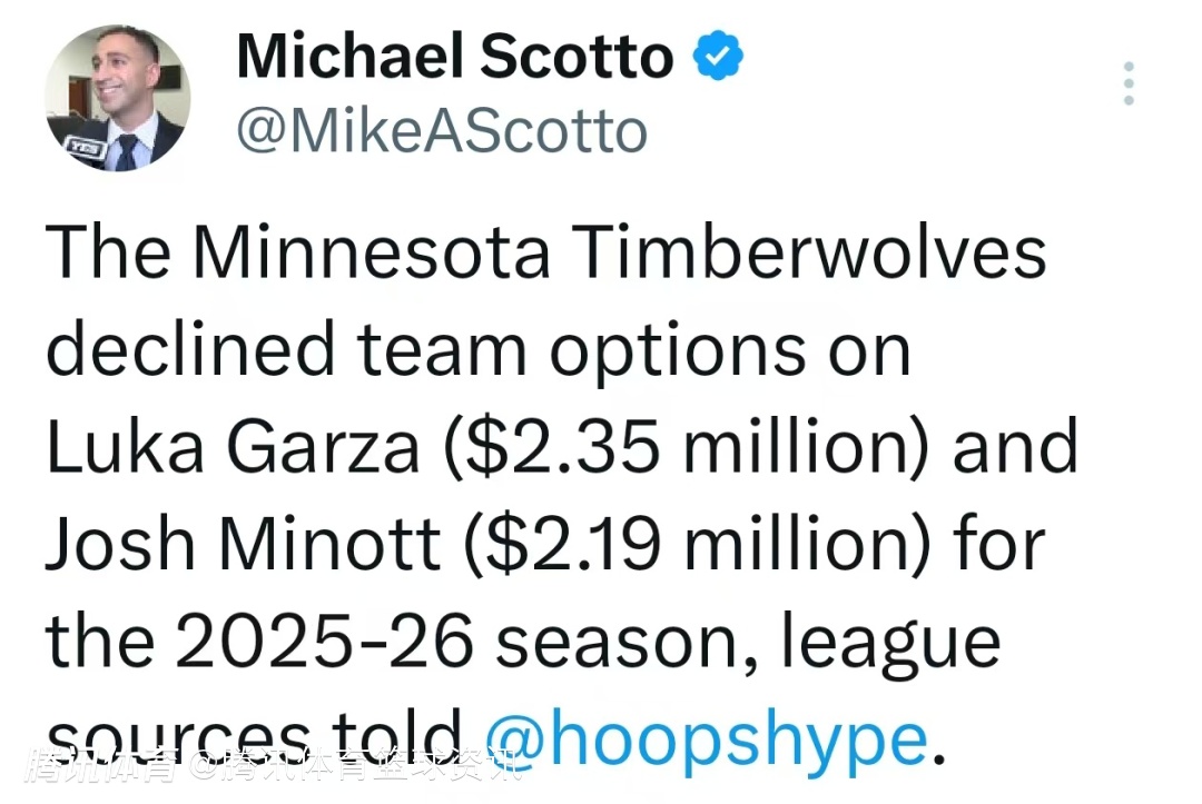 2025-06-30 07:50北京时间6月30日,根据记者Michael Scotto的报道,联盟消息源向HoopsHype透露,明尼苏达森林狼队已拒绝执行2025-26赛季加尔扎(235万美元)和米诺特(219万美元)两人的球队选项。