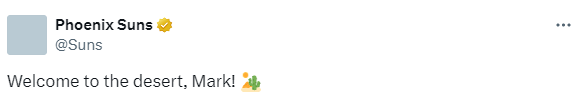 太阳总经理格雷戈里在新闻稿中表示:“马克-威廉姆斯兼具出众的体型和臂展,同时拥有终结能力、护筐、强硬篮板以及传球直觉等宝贵技能组合。他在场上动力十足,带来的无形特质契合我们的球队定位。他的加入强化了中锋位置,我们很兴奋欢迎马克-威廉姆斯来到菲尼克斯。”