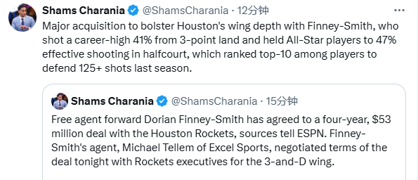 6、火箭与芬尼-史密斯签下4年5300万美元合同,抢走湖人想要签回的优质3D