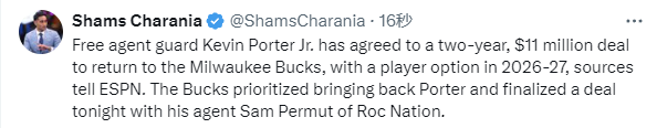 2025-07-01 07:20北京时间7月1日,根据NBA名记Shams报道,雄鹿队已经与小凯文-波特达成一份2年1100万美元的合同,其中包括2026-27赛季的球员选项。详情稍后。