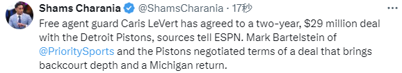 Shams写道:“据ESPN消息源透露,自由球员后卫勒维尔已与底特律活塞队达成一份为期两年、价值2900万美元的合同。PrioritySports的马克-巴特尔斯坦与活塞队就合同条款展开谈判,该签约既为球队补充了后场深度,也让勒维尔重返密歇根州。”