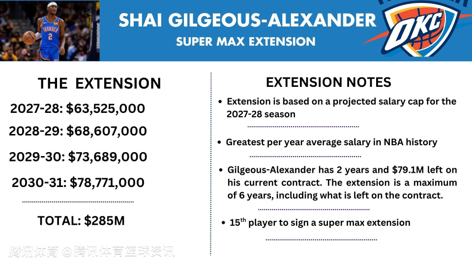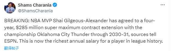 该记者写道:“据ESPN消息源透露,NBA最有价值球员亚历山大已同意与总冠军球队俄克拉荷马城雷霆队签下一份为期四年、价值2.85亿美元的超级顶薪续约合同,合同有效期至2030-31赛季。这一合同成为联盟历史上球员年薪最高的合约。 亚历山大目前作为雷霆队成员已完成两次续约,这巩固了自2019年他加盟雷霆以来双方的合作关系与信任。他加入了在同一赛季同时斩获常规赛MVP与总决赛MVP的球员专属行列。”