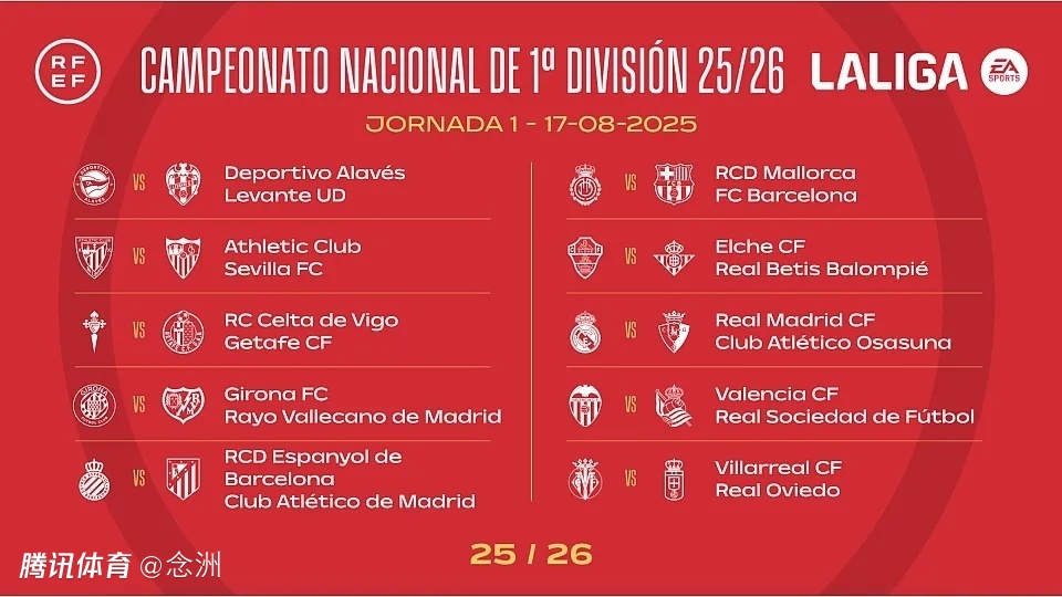 西班牙足协官方公布2025-26赛季西甲赛程,将于8月17日开始,2026年5月24日结束。首轮巴萨客战马洛卡,皇马主场对阵奥萨苏纳,马竞客战西班牙人,新赛季西甲首回合国家德比将于10月26日进行。