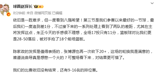 媒体人赵探长发文点评:今天一度看到希望!第三节是我们参赛以来最好的一节球,最后我们一度追到差1分,不过接下来的一系列处理上看到了两队的差距,尤其在主将发挥这点,朱正今天的手感不理想,全场篮板球对比我们28-50落后,被对手抢了18个前场篮板。