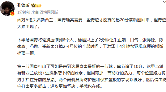 媒体人孔德昕发文点评:面对A组头名新西兰,国青确实需要一些奇迹才能真的把20分落后翻回来,但奇迹太难出现了。
