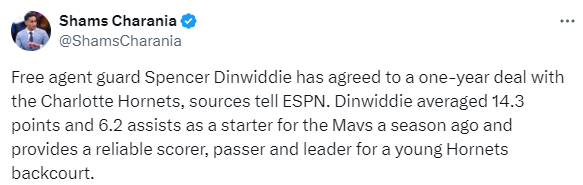 Shams:丁威迪一年合同加盟黄蜂 上季首发场均14+6将成后场可靠支撑
