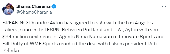 2025-07-03 06:00北京时间7月3日,根据名记Shams的报道,联盟消息源透露,德安德烈-艾顿已同意与洛杉矶湖人队签约,新赛季他通过开拓者和湖人的合同总计将赚取约3400万美元。Innovate Sports经纪公司的Nima Namakian和 WME Sports经纪公司的Bill Duffy与湖人队总裁佩林卡达成了这笔交易。