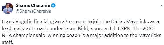 2025-07-03 06:30北京时间7月3日,根据名记Shams的报道,联盟消息源透露,弗兰克-沃格尔正敲定加盟达拉斯独行侠队的协议,将在基德麾下担任首席助教。这位2020年NBA总冠军教头的加入,将是独行侠教练组的重要补强。