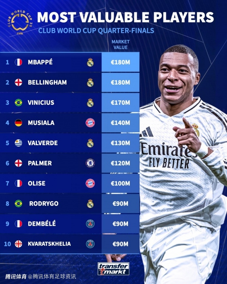 世俱杯球员身价榜:姆巴佩&贝林&维尼修斯包揽前三 前八皇马占5席
