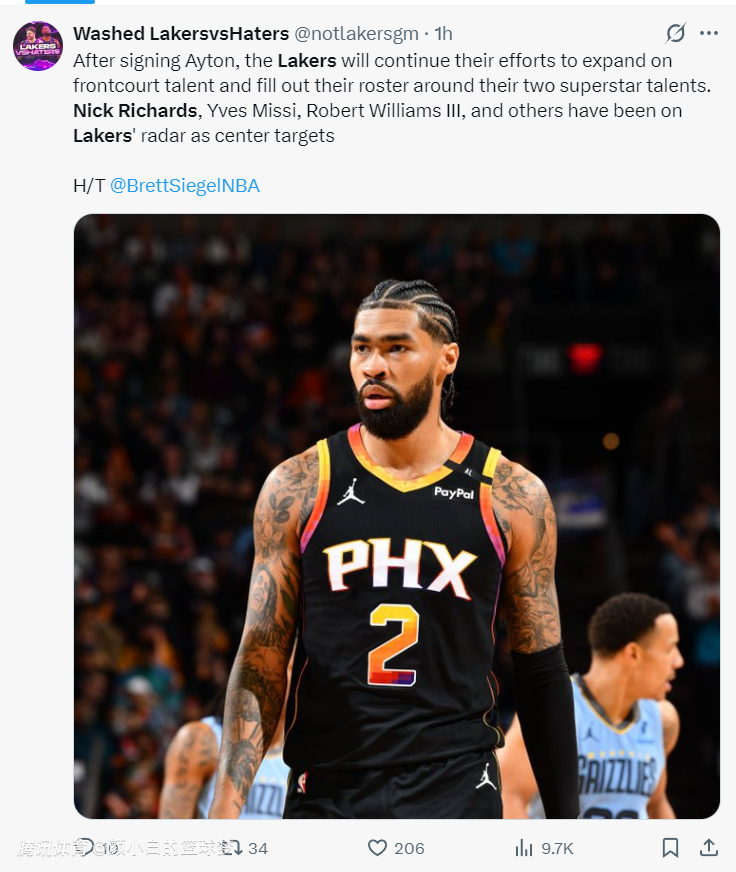 根据NBA记者BrettSiegel的报道,在签下艾顿后湖人将继续努力扩充内线人才储备,并围绕詹姆斯、东契奇两位超巨完善阵容,尼克-理查兹、伊夫-米西、罗伯特-威廉姆斯都是湖人意中人。