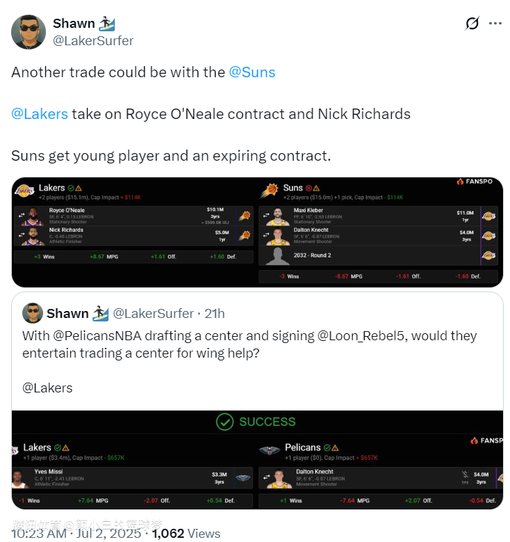湖媒最希望的是与太阳交易,用克勒贝尔、克内克特、2032年次轮签换来理查兹、罗伊斯-奥尼尔,这笔交易不仅能继续储备内线还可以得到一个3D侧翼,小奥尼尔的三分球能力很出众。