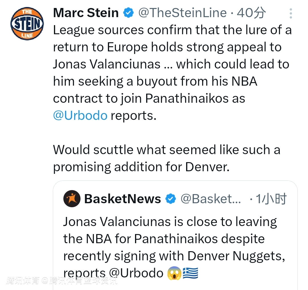 Marc Stein随即跟进报道称,联盟消息源证实,重返欧洲的诱惑对瓦兰丘纳斯仍有强烈吸引力,这可能促使他寻求买断NBA合同,以加盟帕纳辛纳科斯。这一决定将打乱掘金队此前看似前景大好的引援计划。