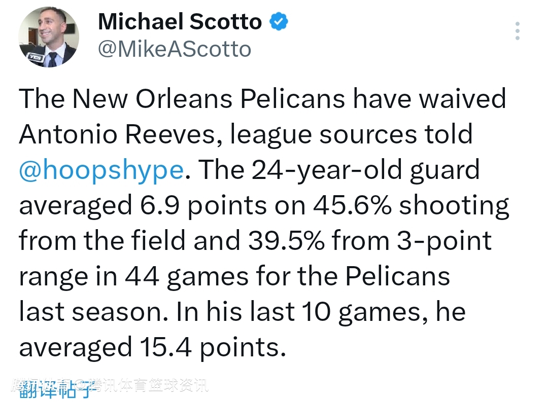 2025-07-04 06:10北京时间7月4日,据HoopsHype记者Michael Scotto报道,鹈鹕队已将后卫安东尼奥-里夫斯裁掉。