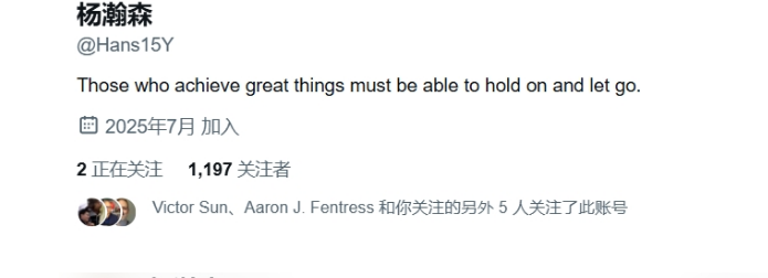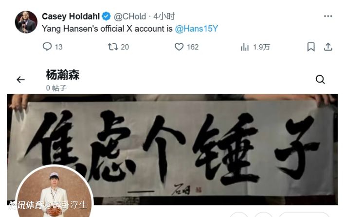 除此之外,杨瀚森在本月也是正式注册了个人的推特账号,尤其是其简介中放了一张“焦虑个锤子”字幅,而签名则是“成大事者,须能坚守亦能释怀。”杨瀚森的如此签名与横幅,均是极具中国新生代网友的特色。