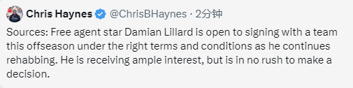 该记者写道:“自由球员达米安-利拉德在继续康复中,他愿意在这个休赛期以合适的条款和条件与一支球队签约。利拉德目前收到了大量报价,但并不急于做出决定。”