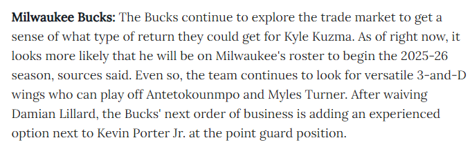 该记者写道:“雄鹿队继续探索交易市场,以了解他们能从库兹马身上获得何种回报。消息人士称,截至目前,他更有可能在2025-26赛季开始时出现在密尔沃基的大名单上。即便如此,球队仍在寻找能够在扬尼斯-阿德托昆博和迈尔斯-特纳身边打球的多功能3D侧翼。在裁掉达米安-利拉德后,雄鹿队的下一项任务是在控卫位置上为小凯文-波特增添一位有经验的选择。”