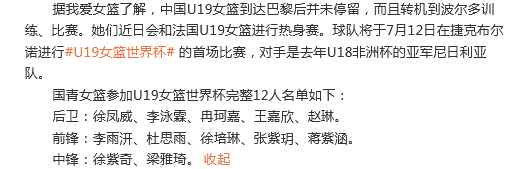 她们近日会和法国U19女篮进行热身赛。球队将于7月12日在捷克布尔诺进行U19女篮世界杯 的首场比赛,对手是去年U18非洲杯的亚军尼日利亚队。