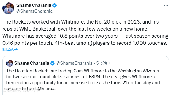 13、火箭1换2交易惠特莫尔,换来两个次轮签