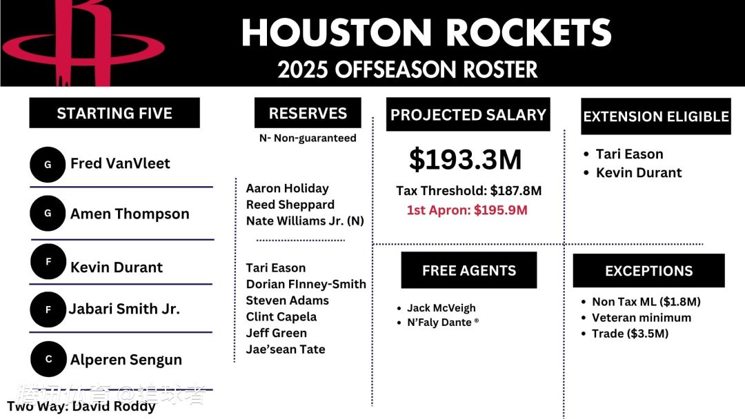 14名常规合同球员:杜兰特、范弗利特、阿门-汤普森、小贾巴里-史密斯、申京、阿隆-霍勒迪、谢泼德、伊森、芬尼-史密斯、亚当斯、卡佩拉、杰夫-格林、泰特和内特-威廉姆斯