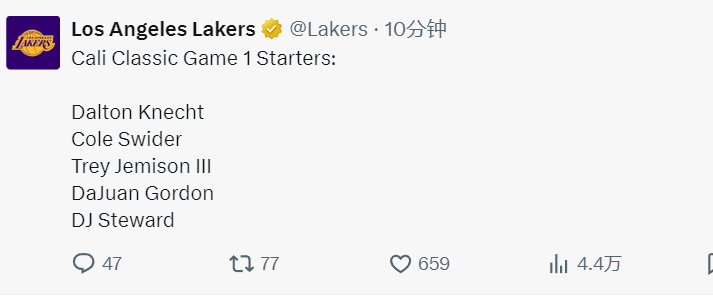 湖人方面本场排出的首发阵容为:克内克特、科尔-斯威德、特雷-杰米森、达胡安-戈登和DJ-斯图尔德。