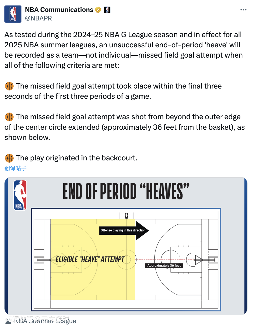 联盟将会在发展联盟24-25赛季和夏季联赛中全面试行新规,表示当满足以下所有条件时,不成功的节末“投篮”将被记录为球队(而非个人)投篮不中: