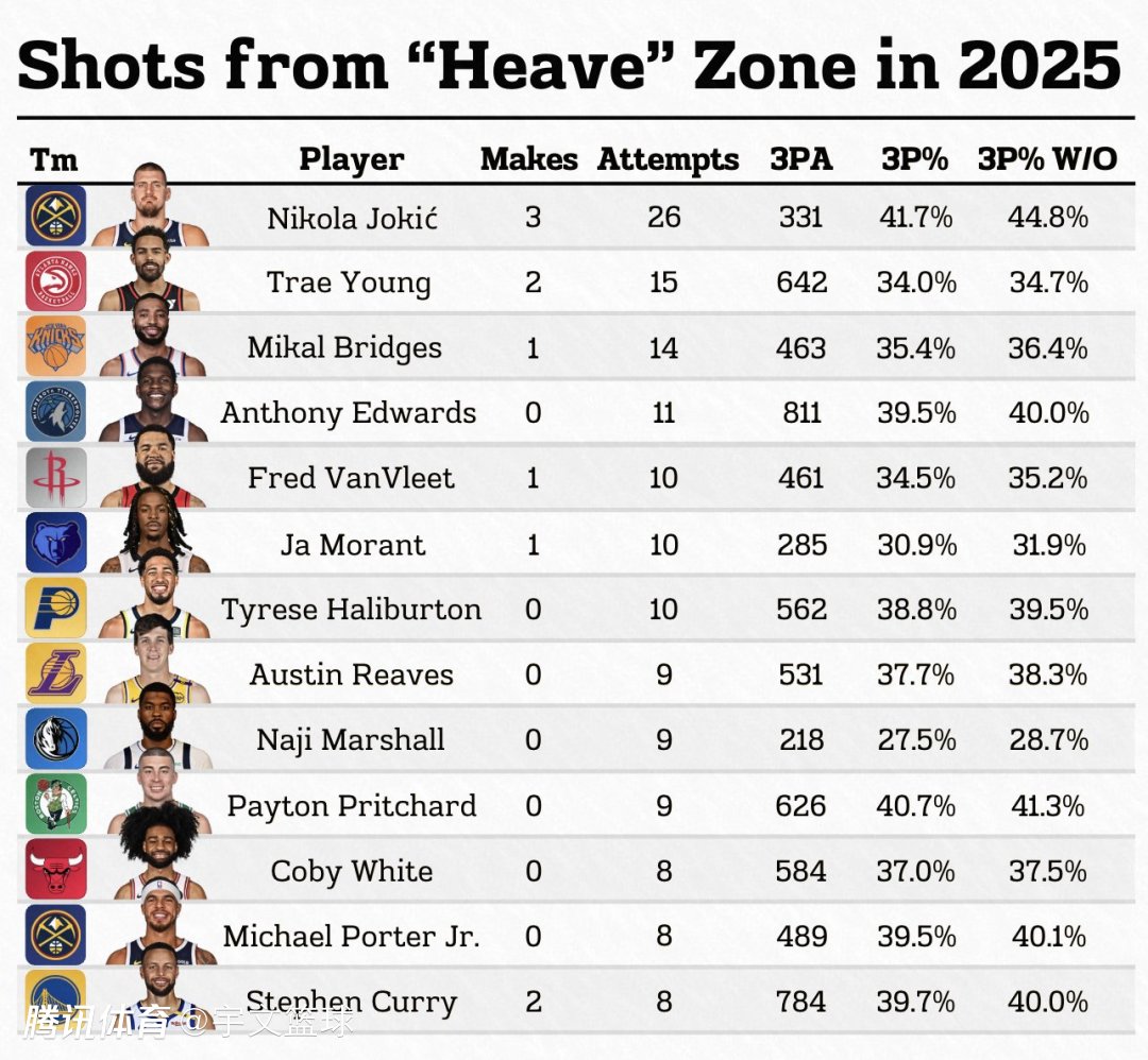 美媒对此进行相关统计,在24-25赛季中超远三分出手最多的球员是约基奇,我们经常看到他在前三节进攻时间所剩无几情况下,在后场单手“甩狙”。他一共有22次这种类型超远三分出手,并命中了其中3球,是整个赛季命中数最多的球员。在新规修正情况下,约基奇的三分命中率将会从41.7%上涨至44.8%。