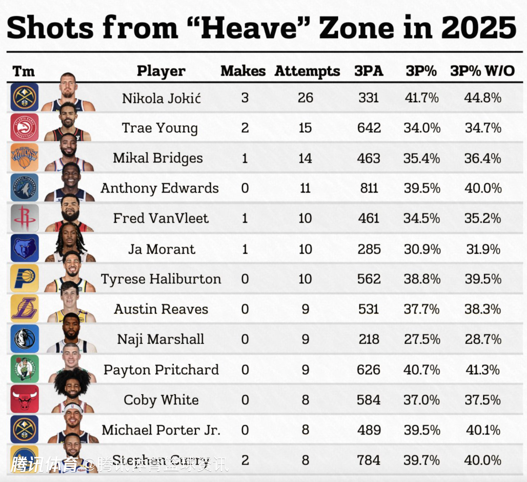 有媒体也列出了上赛季若除去超远压哨出手,一些经常出手这些投篮球员的三分球命中率提升,其中约基奇的涨幅最大,若除去超远压哨三分出手,他的三分球命中率从41.7%提升至44.8%。