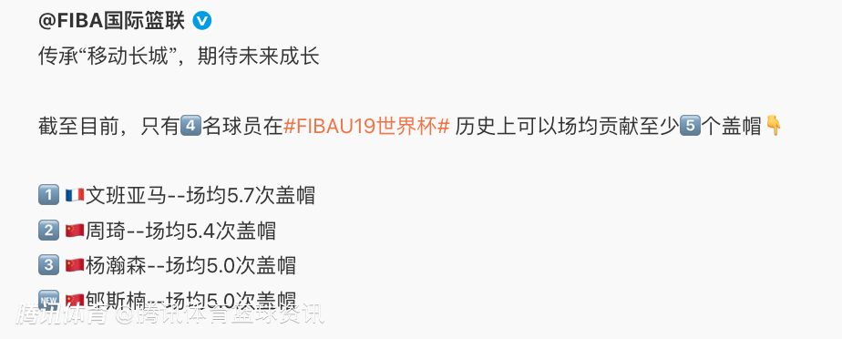 郇斯楠在本届比赛场均可以贡献5次盖帽,据统计,截至目前,只有4名球员在U19男篮世界杯历史上可以场均贡献至少5个盖帽。