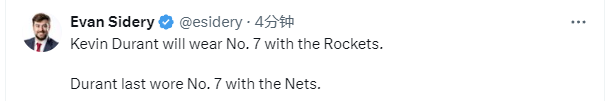 2025-07-07 08:00北京时间7月7日,围绕杜兰特进行的7队大交易正式完成,而NBA记者Evan Sidery透露,杜兰特在火箭队将身披7号球衣。