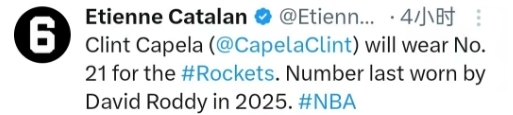 此外,火箭队的另外一名新援卡佩拉的号码也公布,他将身披21号球衣。此前卡佩拉效力火箭队时,身穿的是15号球衣,但目前15号球衣归属于谢泼德。