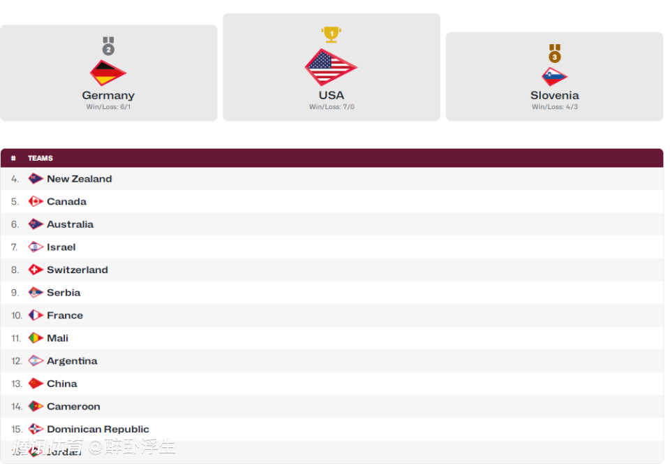 美国队7战全胜夺冠,且场均轰下114.6分刷新赛会历史纪录,美国队核心AJ-迪班萨获得赛会MVP与入选最佳阵容一阵。