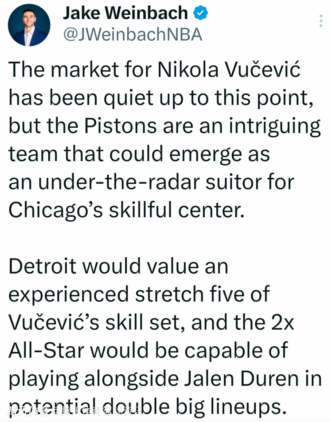 Jake Weinbach表示,活塞会看重武切维奇作为经验丰富的空间型五号位的技术特点,这位两次入选全明星的球员能够在潜在的双塔阵容中与杰伦-杜伦并肩作战。如果活塞真的有意,他们可以向公牛提出以24岁中锋以赛亚-斯图尔特为核心的直接互换交易方案。