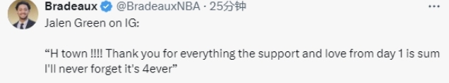 杰伦-格林写道:“休斯顿!感谢你们所做的一切,从第一天起你们的支持与爱意就是我永远不会忘记的点滴,这份情谊至死不渝。”