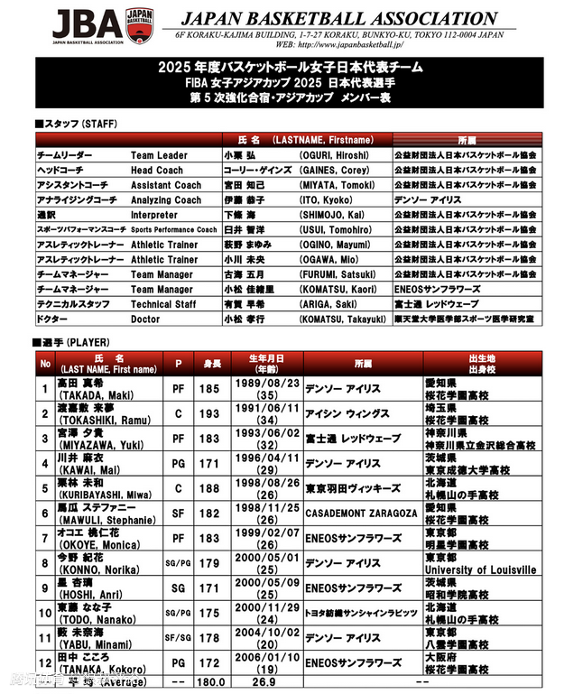 针对张子宇?日本女篮亚洲杯12人:核心内线回归 平均身高1米8创新高