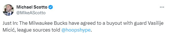 2025-07-08 06:00北京时间7月8日,据Hoopshype记者Michael Scotto报道,密尔沃基雄鹿队已同意与后卫米西奇达成买断协议。