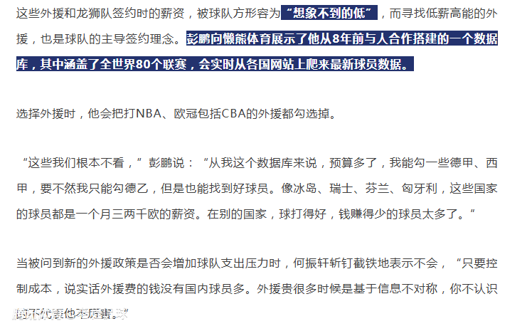 广州男篮深信他们可以找到物美价廉的外援,而CBA很多外援之所以贵,很多时候是因为信息不对称,导致很多其他俱乐部在引进外援上吃亏。广州男篮认为他们搭建的数据库可以帮助他们找到合适的外援。