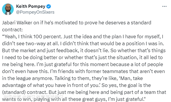 贾巴里-沃克表示:“当然,我百分百有这个动力。就我对自己的规划和设想而言,我完全没考虑过双向合同,也从没想过自己会处于这样的处境。但市场反馈不会说谎,无论是我需要在哪些方面做得更好,还是单纯受客观情况影响,种种因素最终让我走到了现在。”