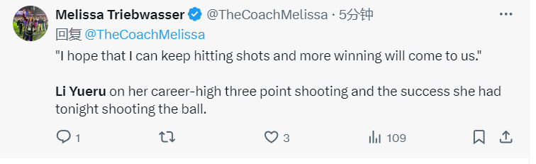 本场李月汝创造WNBA生涯单场三分命中数纪录,此前最多是效力西雅图风暴时对阵达拉斯飞翼命中2记三分。李月汝在谈及自己职业生涯新高的三分球表现以及今晚出色的投篮手感时说道:“我希望自己能继续命中投篮,这样我们就能赢下更多比赛。”