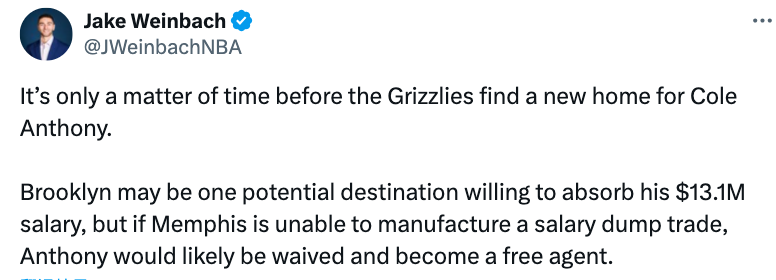 Jake Weinbach表示,灰熊为科尔-安东尼找到下家只是时间问题,篮网可能会愿意承担他1310万的薪水,如果灰熊无法促成一笔甩掉其薪资的交易,那么安东尼很可能会被买断,成为自由球员。前不久,灰熊将贝恩交易至魔术,换波普+科尔-安东尼+四个不受保护的首轮签+一个首轮签互换权。