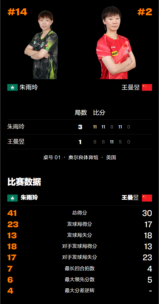 王曼昱是现役世界排名第2的国乒世界冠军主力,朱雨玲是曾经排名世界第1的前国乒主力、但现在已经代表中国澳门队参加国际比赛,双方运动员的身份也让本场对决颇具看点。