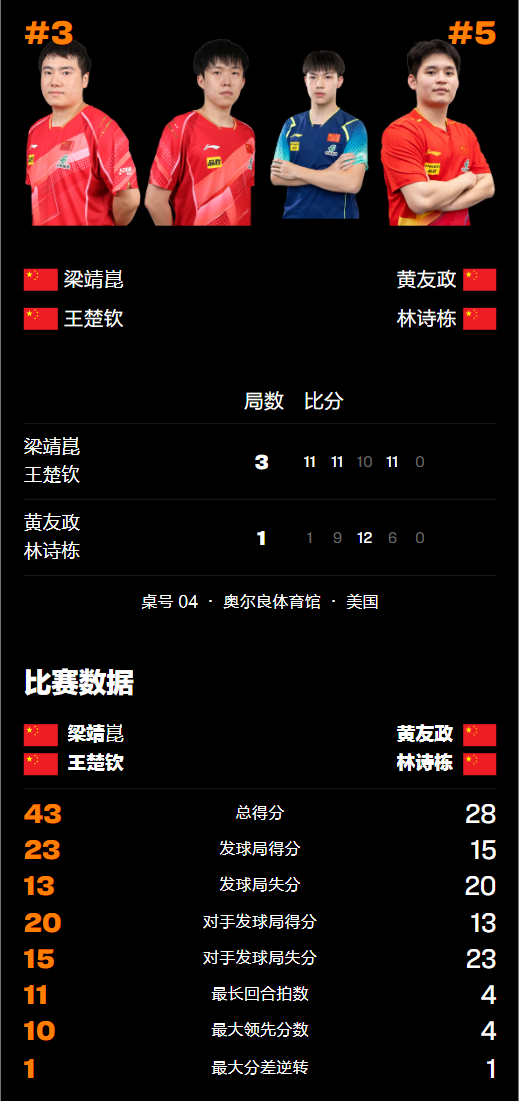 第四局王楚钦/梁靖崑重振旗鼓,再次以强势进攻突破林诗栋/黄友政的防线,很快便取得9-3领先的优势但随后连丢3分于是选择暂停进行调整,随后连得2分、以11-6锁定胜利,由此而成功锁定男双半决赛的门票,下一轮将迎战世界排名第一的男双组合勒布伦兄弟。