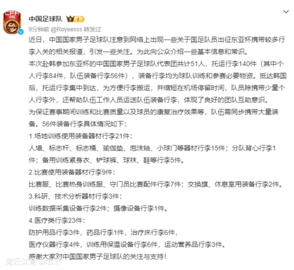 对此,国足官方发布声明,写道,“本次赴韩参加东亚杯的中国国家男子足球队代表团共计51人,托运行李140件(其中个人行李84件,队伍装备行李56件),装备行李均为球队训练和参赛必要物资。抵达韩国后,托运行李集中到达,为方便行李搬运,并缩短在机场停留时间,队员除携带少量个人行李外,还帮助队伍工作人员运送队伍装备行李,体现了良好的团队互助意识。”