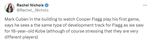 2025-07-11 11:10北京时间7月11日,独行侠小老板库班接受媒体采访,谈到了库珀-弗拉格在夏季联赛中的表现。