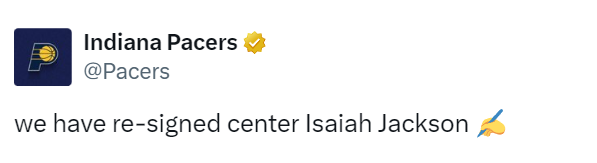 2025-07-12 05:30北京时间7月12日,步行者官方宣布,球队已经与中锋以赛亚-杰克逊成功续约。据此前Shams的报道,这是一份3年2100万美元的合同。