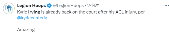 对于复出时间,欧文本人并未给出明确计划,此前在直播中他曾表示:“我不想预测复出节点,只希望以150000%的状态回归,所以目前正稳步推进康复。”根据名记Shams透露,欧文最早有望明年1月左右复出。