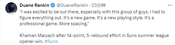 2025-07-12 12:50北京时间7月12日,NBA夏季联赛继续进行,太阳队103-84击败奇才队。太阳队选中的10号秀马鲁阿奇此役出战21分钟,13投5中(三分球6投1中)得到14分5篮板1助攻1抢断2盖帽,在场正负值-6。赛后,马鲁阿奇接受媒体采访,点评了比赛。