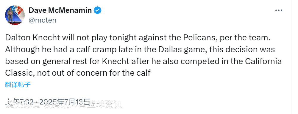 2025-07-13 08:00北京时间7月13日,据记者Dave McMenamin报道,湖人队内部消息透露,克内克特今天不会出战对阵鹈鹕队的比赛。尽管他在对阵独行侠的比赛末段出现了小腿抽筋的情况,但这一决定是出于让克内克特进行常规休息,而非担心其小腿伤势。